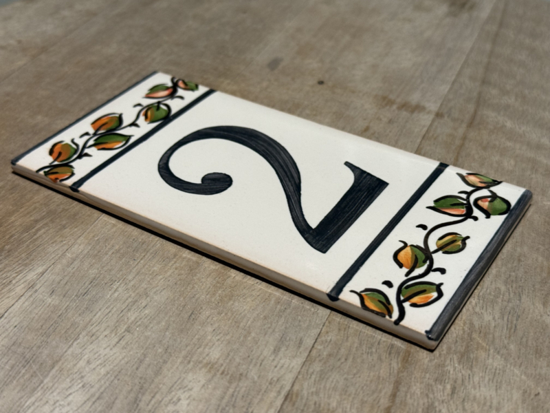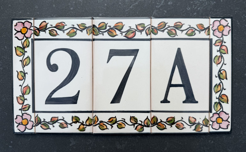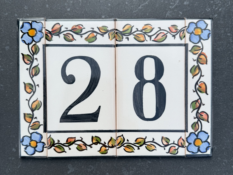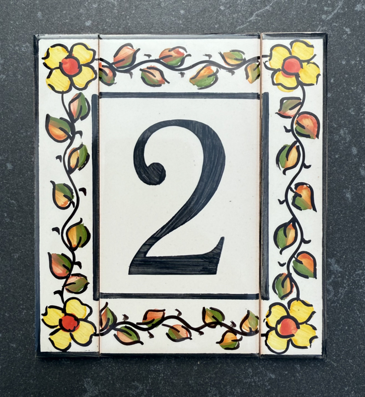 Artikelnummer: AC04027 OverzichtHandbeschilderd huisnummer op tegel. Maak uw eigen samenstelling met de cijfers die u nodig hebt en kies uw favoriete bloemenkleur uit voor de twee zijrandjes, om de tegels af te sluiten aan de zijkant. Dit wordt zeer waarschinlijk de nieuwe blikvanger bij de ingang van uw woning 🤩🏠
