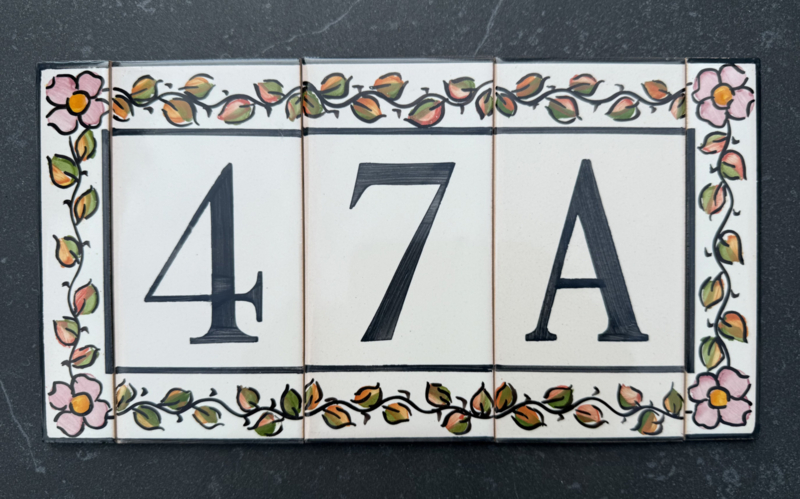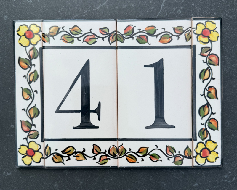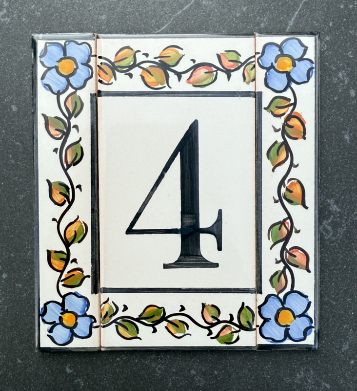 Artikelnummer: AC04029 OverzichtHandbeschilderd huisnummer op tegel. Maak uw eigen samenstelling met de cijfers die u nodig hebt en kies uw favoriete bloemenkleur uit voor de twee zijrandjes, om de tegels af te sluiten aan de zijkant. Dit wordt zeer waarschinlijk de nieuwe blikvanger bij de ingang van uw woning 🤩🏠