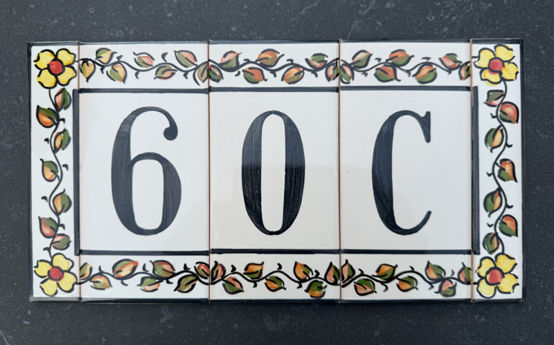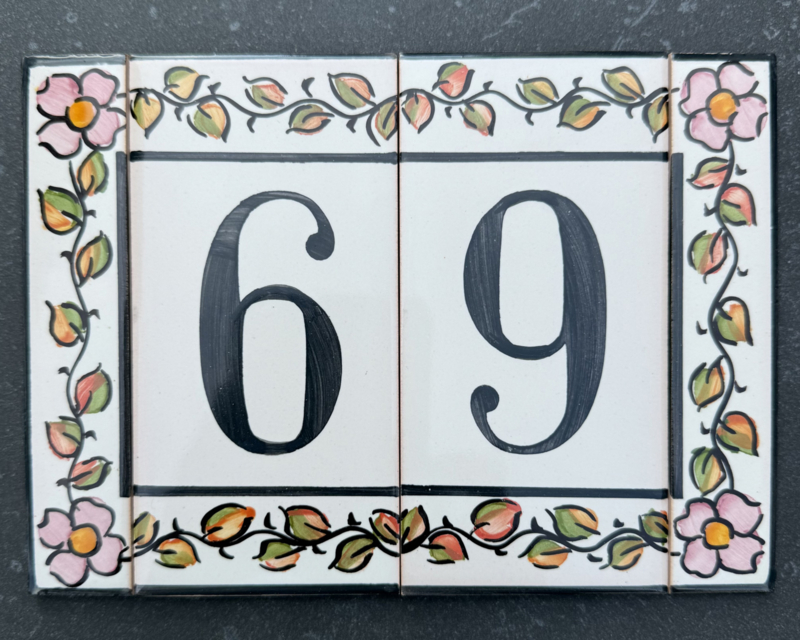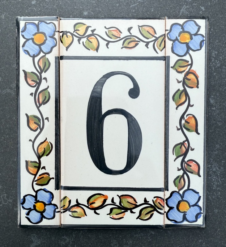 Artikelnummer: AC04031 OverzichtHandbeschilderd huisnummer op tegel. Maak uw eigen samenstelling met de cijfers die u nodig hebt en kies uw favoriete bloemenkleur uit voor de twee zijrandjes, om de tegels af te sluiten aan de zijkant. Dit wordt zeer waarschinlijk de nieuwe blikvanger bij de ingang van uw woning 🤩🏠
