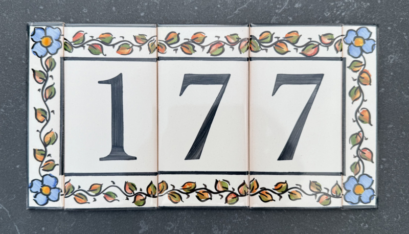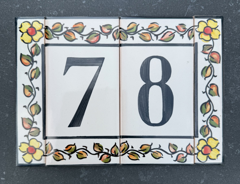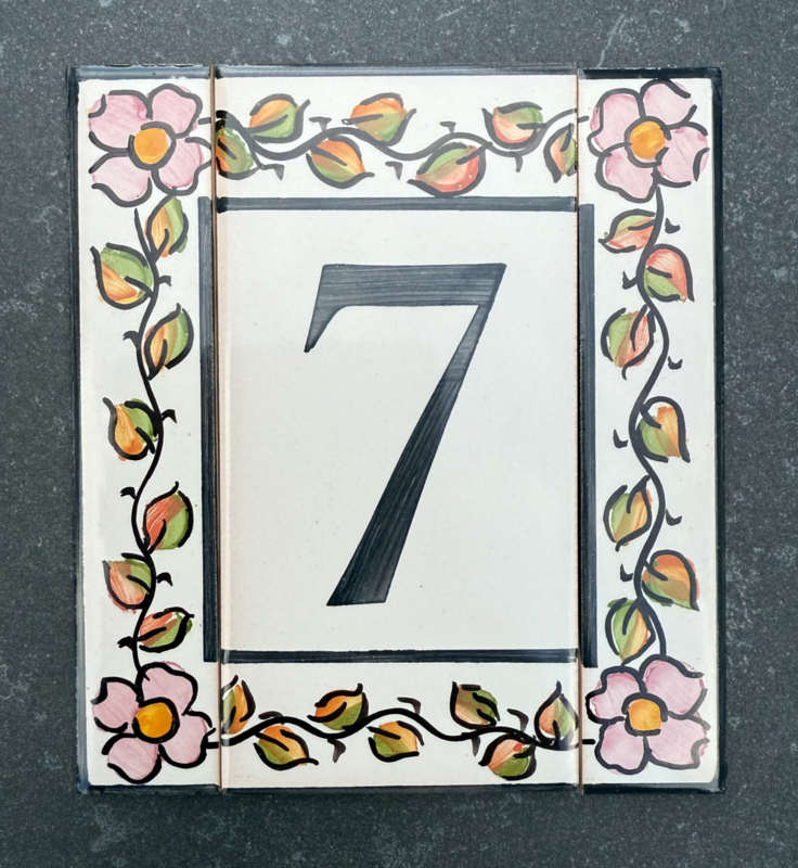 Artikelnummer: AC04032 OverzichtHandbeschilderd huisnummer op tegel. Maak uw eigen samenstelling met de cijfers die u nodig hebt en kies uw favoriete bloemenkleur uit voor de twee zijrandjes, om de tegels af te sluiten aan de zijkant. Dit wordt zeer waarschinlijk de nieuwe blikvanger bij de ingang van uw woning 🤩🏠