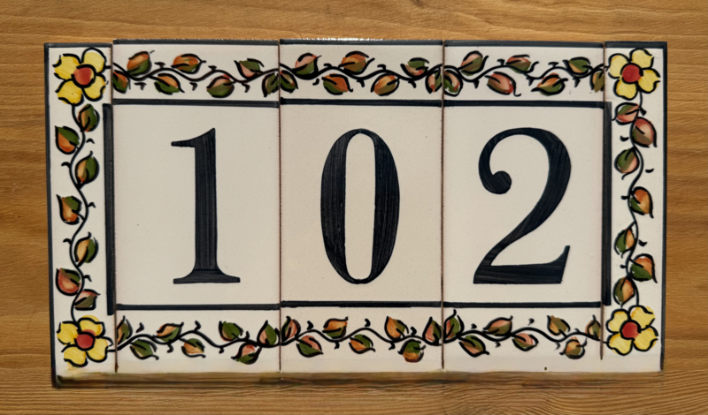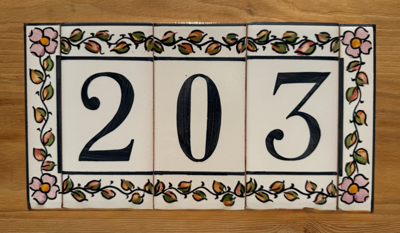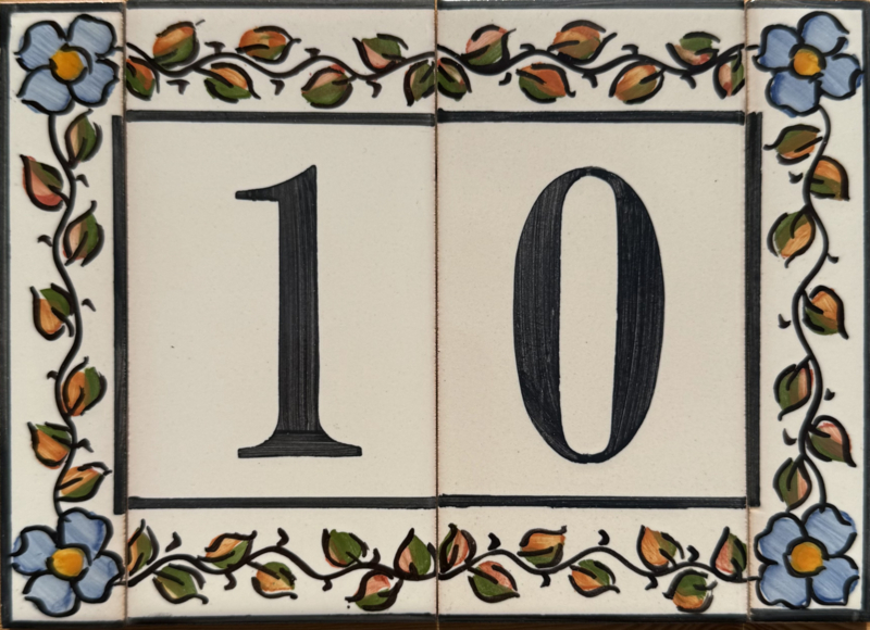 Artikelnummer: AC04035 OverzichtHandbeschilderd huisnummer op tegel. Maak uw eigen samenstelling met de cijfers die u nodig hebt en kies uw favoriete bloemenkleur uit voor de twee zijrandjes, om de tegels af te sluiten aan de zijkant. Dit wordt zeer waarschinlijk de nieuwe blikvanger bij de ingang van uw woning 🤩🏠