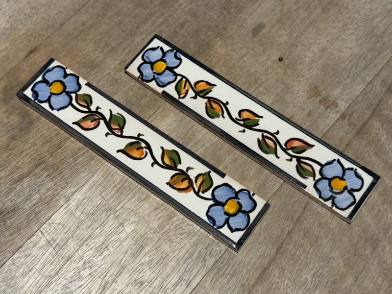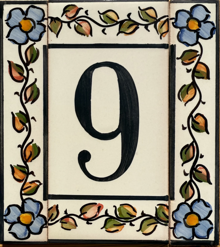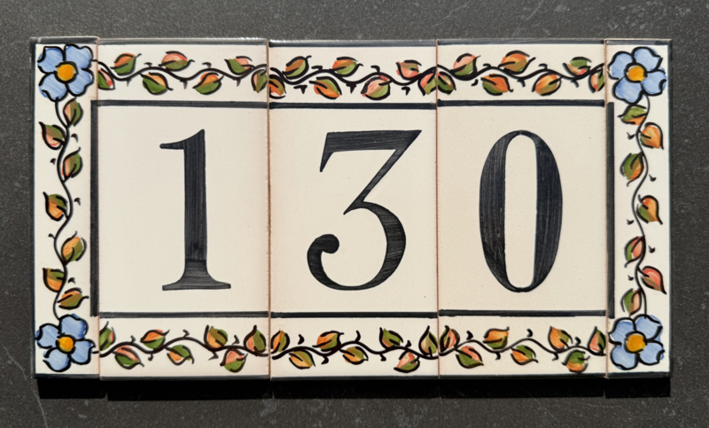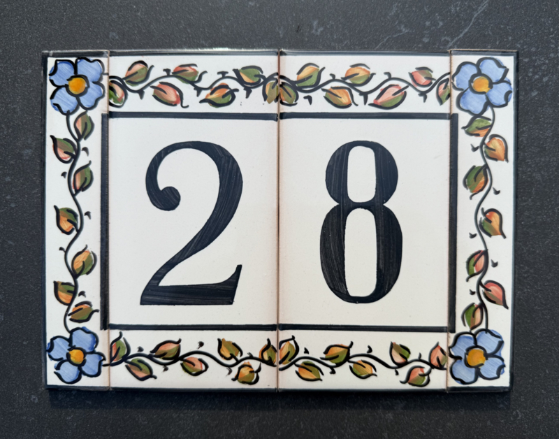 Artikelnummer: AC04041 OverzichtHandbeschilderde rand op tegel. Maak uw eigen samenstelling met de cijfers die u nodig hebt en kies uw favoriete bloemenkleur uit voor de zijrandjes, om de tegels af te sluiten aan de zijkant. Dit wordt zeer waarschinlijk de nieuwe blikvanger bij de ingang van uw woning 🤩🏠