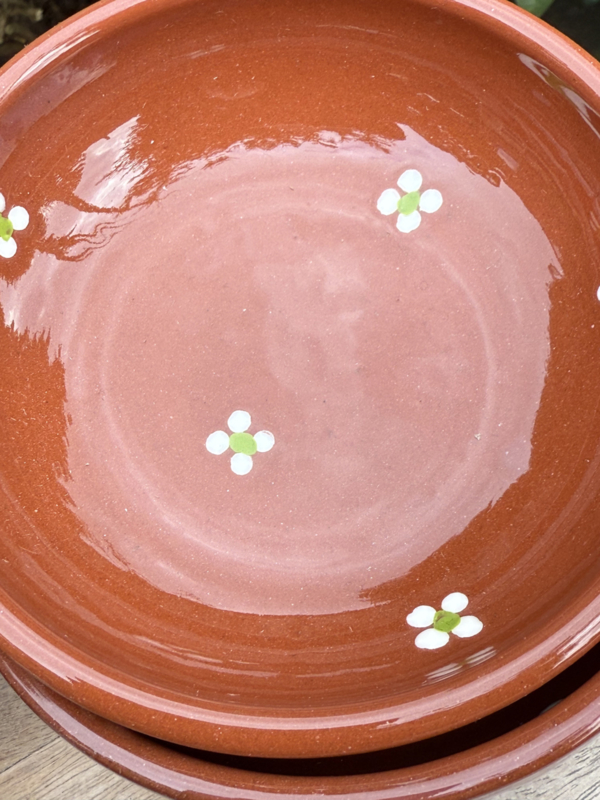 Breng de charme van Portugal direct naar uw tafel met dit ambachtelijke, lage schaaltje met een schuine wand. Gemaakt van robuust bruinrood aardewerk en verfraaid met delicate witte bloemetjes, is dit item een prachtige en veelzijdige toevoeging aan uw mediterrane servies.