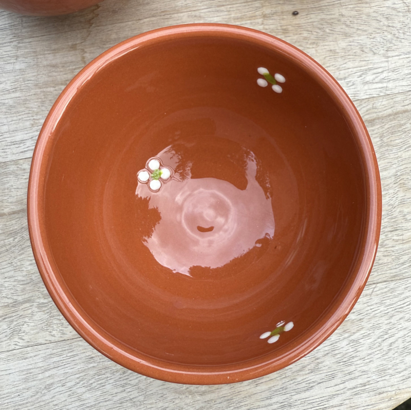 Breng de charme van Portugal direct naar uw tafel met dit ambachtelijke, diepe schaaltje. Gemaakt van robuust bruinrood aardewerk en verfraaid met delicate witte bloemetjes, is dit item een prachtige en veelzijdige toevoeging aan uw servies.