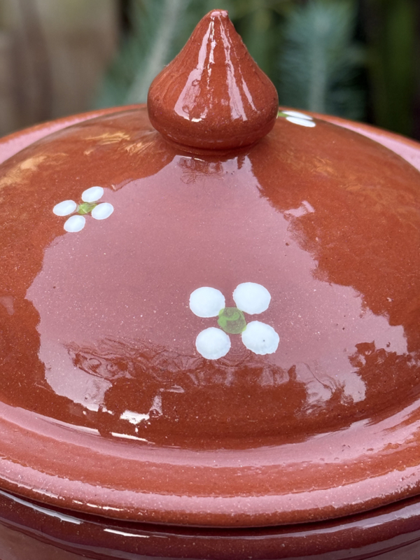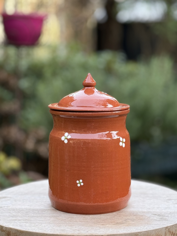 Breng de charme van Portugal in uw keuken met deze prachtige voorraadpot met deksel. Gemaakt van robuust bruinrood aardewerk en verfraaid met delicate witte bloemetjes, is dit item een stijlvolle en praktische manier om uw ingrediรซnten op te bergen en tegelijkertijd uw aanrecht op te sieren.