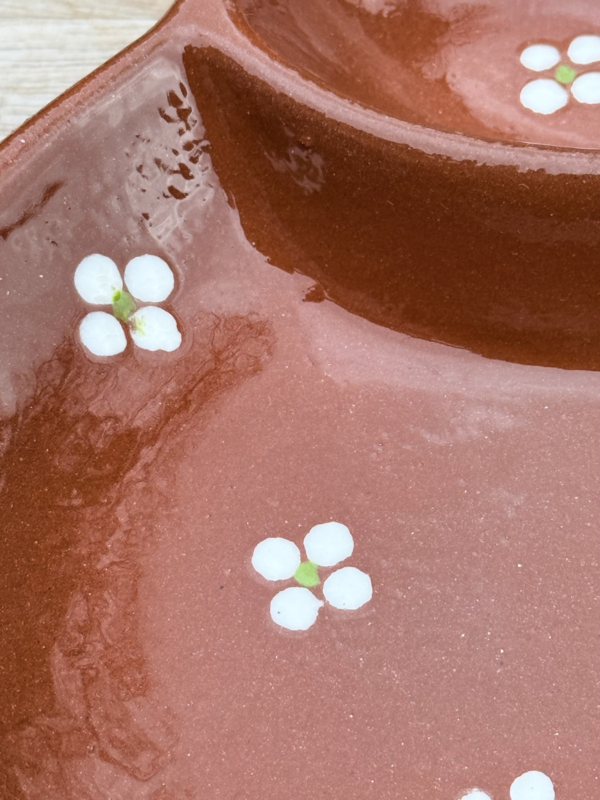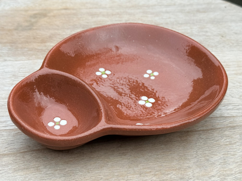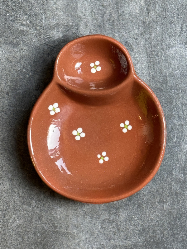 Breng de charme van Portugal naar uw tafel met deze prachtig geglazuurde schaal voor olijven, voorzien van een handig geรฏntegreerd vakje voor de olijfpitjes. Gemaakt van robuust bruinrood aardewerk en verfraaid met delicate witte bloemetjes, is dit functionele item een prachtige toevoeging die zowel praktisch als decoratief is.