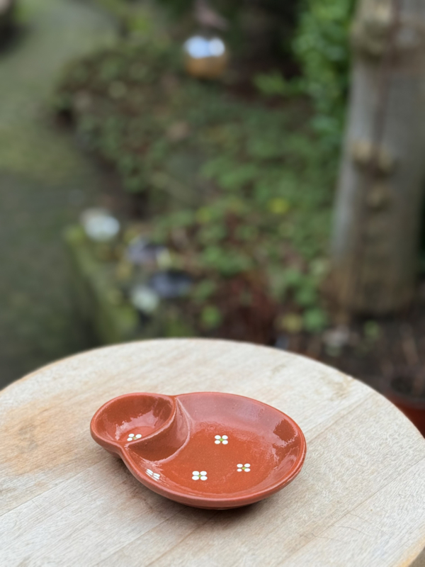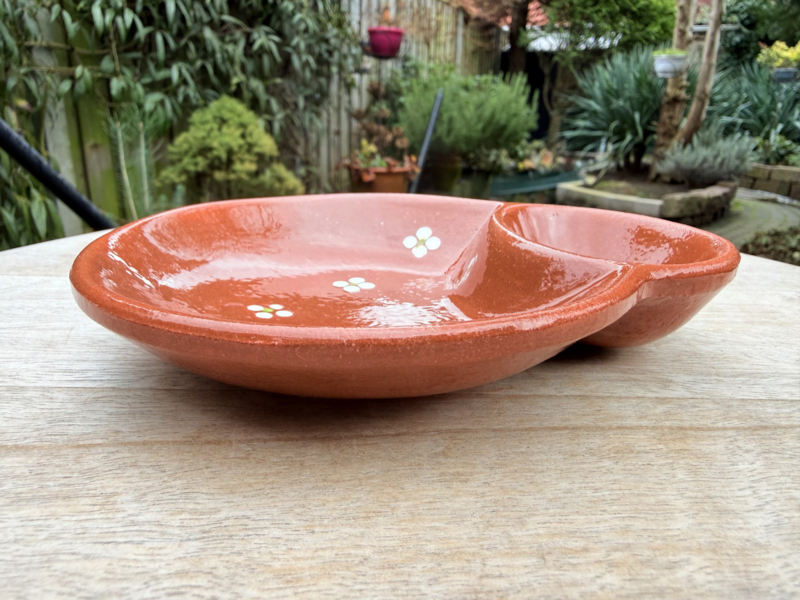 Met dit item kunt u gegarandeerd olijfjes of bijvoorbeeld nootjes op tafel presenteren op een uiterst sfeervolle en mediterrane manier. Het aparte vakje zorgt ervoor dat uw tafel netjes blijft. Het geglazuurde aardewerk is eenvoudig te onderhouden en kan na gebruik gewoon in de vaatwasser (kort programma aanbevolen).