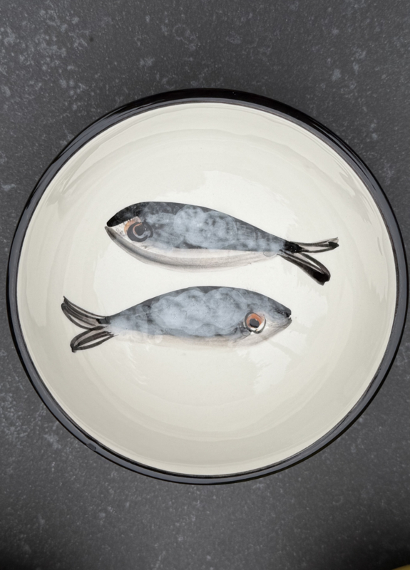 Breng een zonnig en maritiem accent naar je tafel met deze prachtige ronde kom uit de geliefde "Sardines" collectie. Deze kom, uitgevoerd in een praktisch medium-klein formaat, combineert traditioneel Portugees vakmanschap met een fris en modern design.