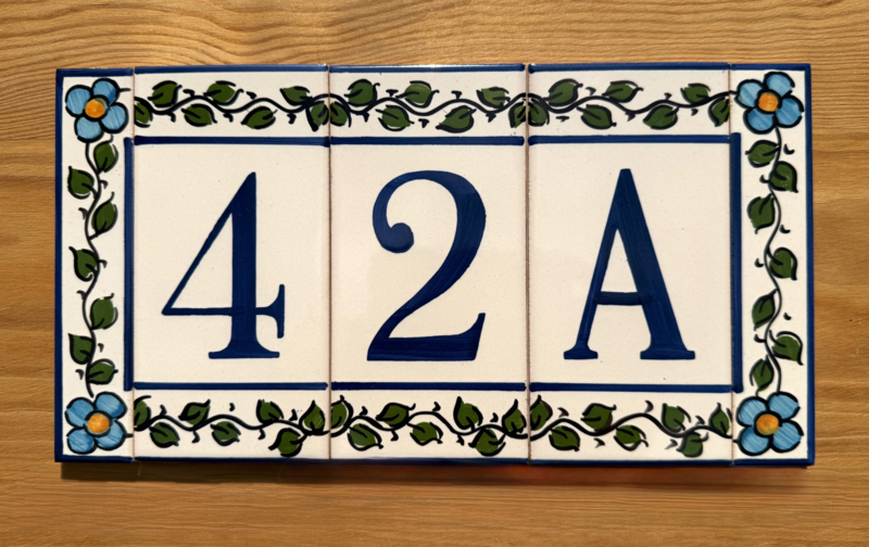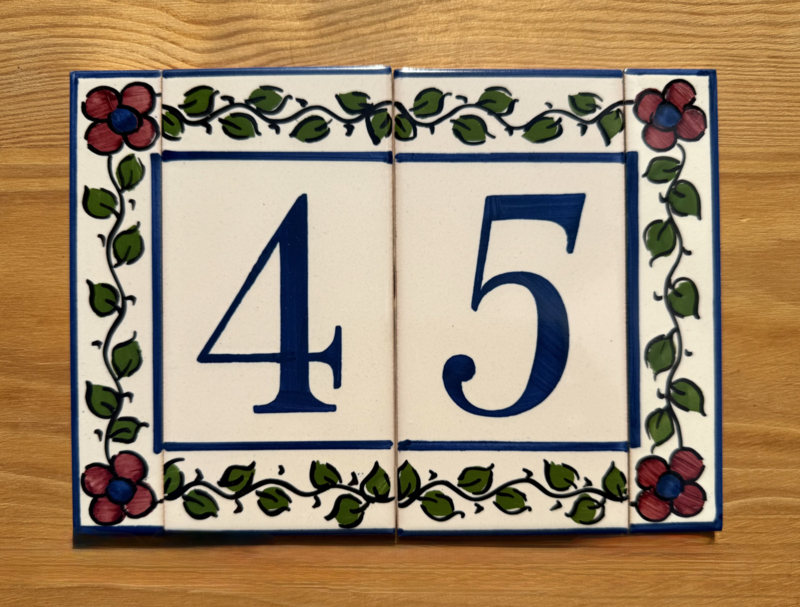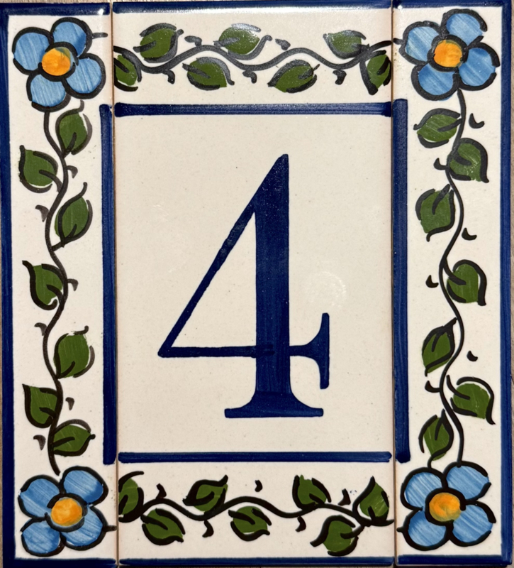 Artikelnummer: AC04004 OverzichtHandbeschilderd huisnummer op tegel. Maak uw eigen samenstelling met de cijfers die u nodig hebt en kies uw favoriete bloemenkleur uit voor de twee zijrandjes, om de tegels af te sluiten aan de zijkant. Dit wordt zeer waarschinlijk de nieuwe blikvanger bij de ingang van uw woning 🤩🏠
