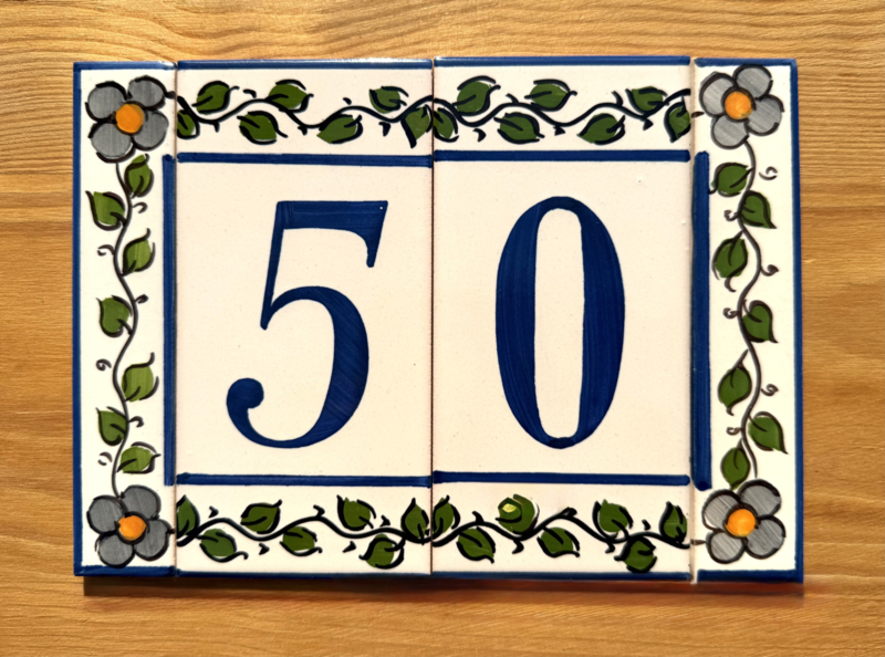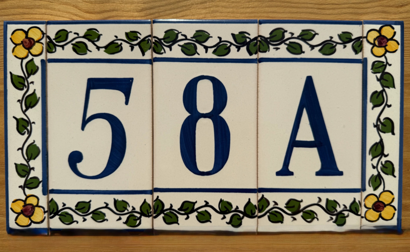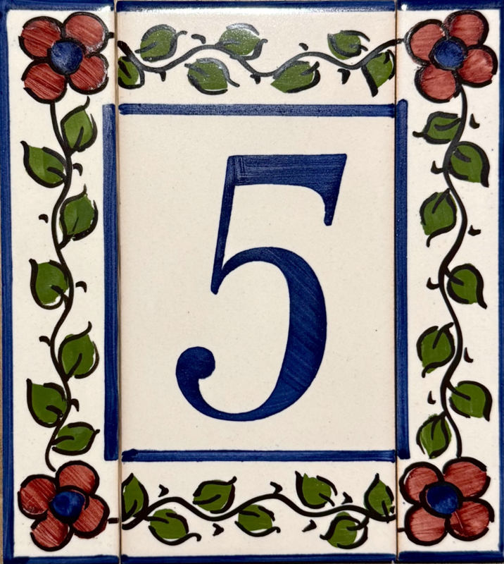 Artikelnummer: AC04005 OverzichtHandbeschilderd huisnummer op tegel. Maak uw eigen samenstelling met de cijfers die u nodig hebt en kies uw favoriete bloemenkleur uit voor de twee zijrandjes, om de tegels af te sluiten aan de zijkant. Dit wordt zeer waarschinlijk de nieuwe blikvanger bij de ingang van uw woning 🤩🏠