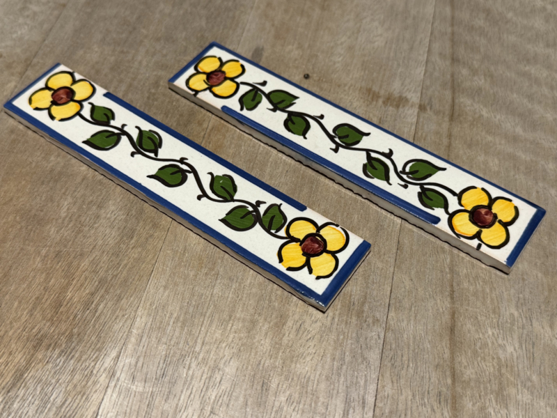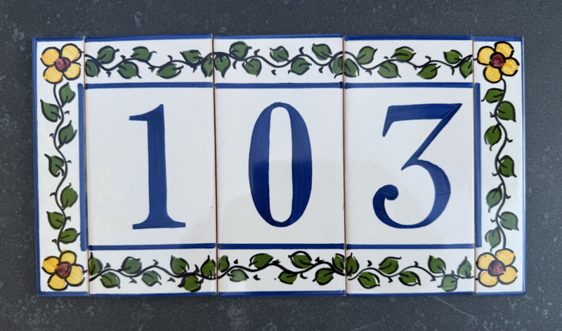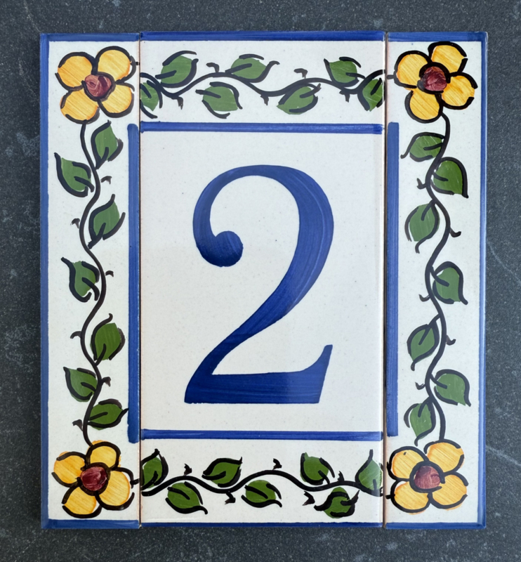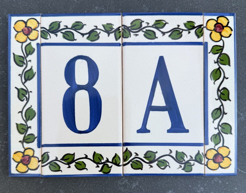 Artikelnummer: AC04020 OverzichtHandbeschilderde rand op tegel. Maak uw eigen samenstelling met de cijfers die u nodig hebt en kies uw favoriete bloemenkleur uit voor de zijrandjes, om de tegels af te sluiten aan de zijkant. Dit wordt zeer waarschinlijk de nieuwe blikvanger bij de ingang van uw woning 🤩🏠