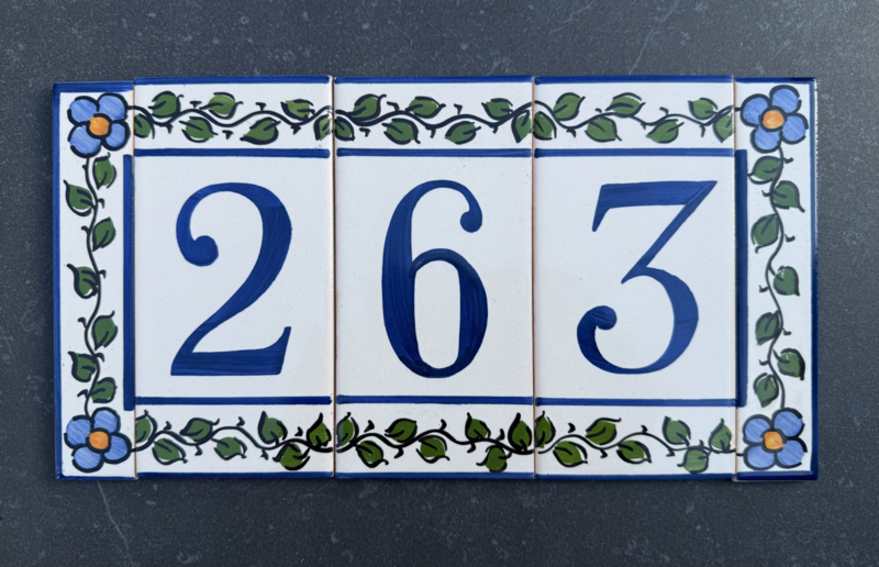 Artikelnummer: AC04018 OverzichtHandbeschilderde rand op tegel. Maak uw eigen samenstelling met de cijfers die u nodig hebt en kies uw favoriete bloemenkleur uit voor de zijrandjes, om de tegels af te sluiten aan de zijkant. Dit wordt zeer waarschinlijk de nieuwe blikvanger bij de ingang van uw woning 🤩🏠