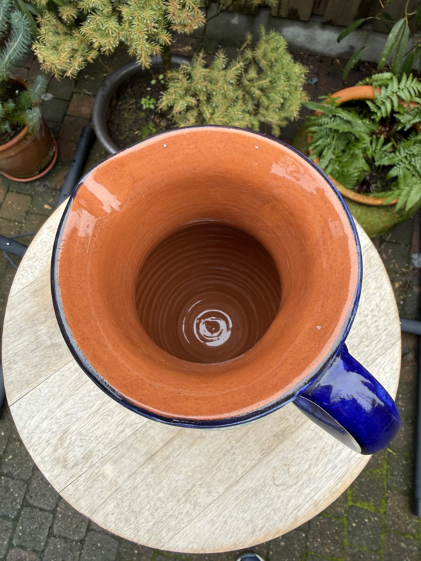 - Let op: Aardewerk is een poreus materiaal. Wij adviseren om een klein bordje of een onderzetter te gebruiken onder de kan, aangezien de onderkant tijdens gebruik vochtig kan worden door condensatie of de eigenschappen van het materiaal.