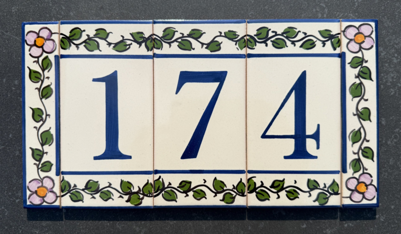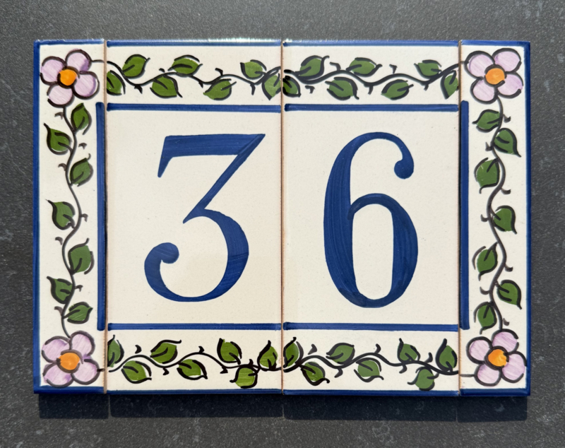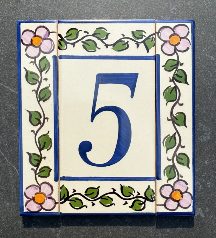 Artikelnummer: AC04023 OverzichtHandbeschilderde rand op tegel. Maak uw eigen samenstelling met de cijfers die u nodig hebt en kies uw favoriete bloemenkleur uit voor de zijrandjes, om de tegels af te sluiten aan de zijkant. Dit wordt zeer waarschinlijk de nieuwe blikvanger bij de ingang van uw woning 🤩🏠