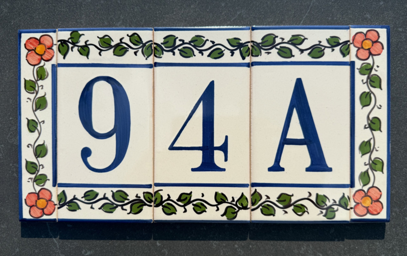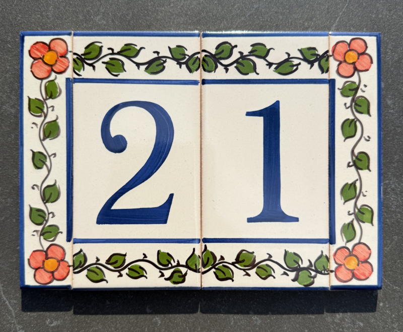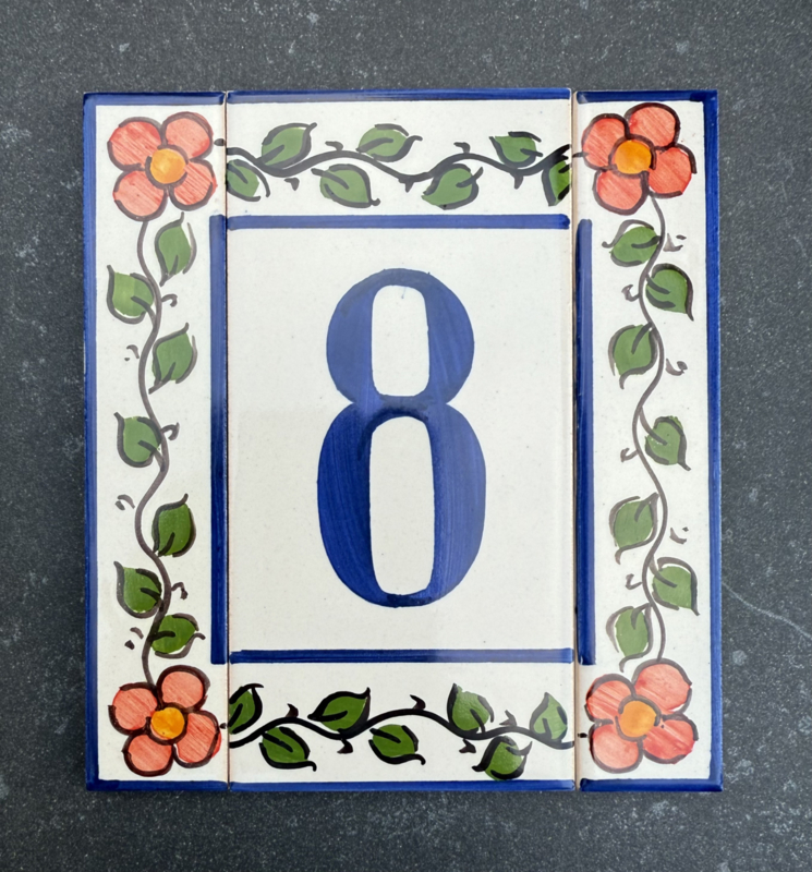 Artikelnummer: AC04021 OverzichtHandbeschilderde rand op tegel. Maak uw eigen samenstelling met de cijfers die u nodig hebt en kies uw favoriete bloemenkleur uit voor de zijrandjes, om de tegels af te sluiten aan de zijkant. Dit wordt zeer waarschinlijk de nieuwe blikvanger bij de ingang van uw woning 🤩🏠