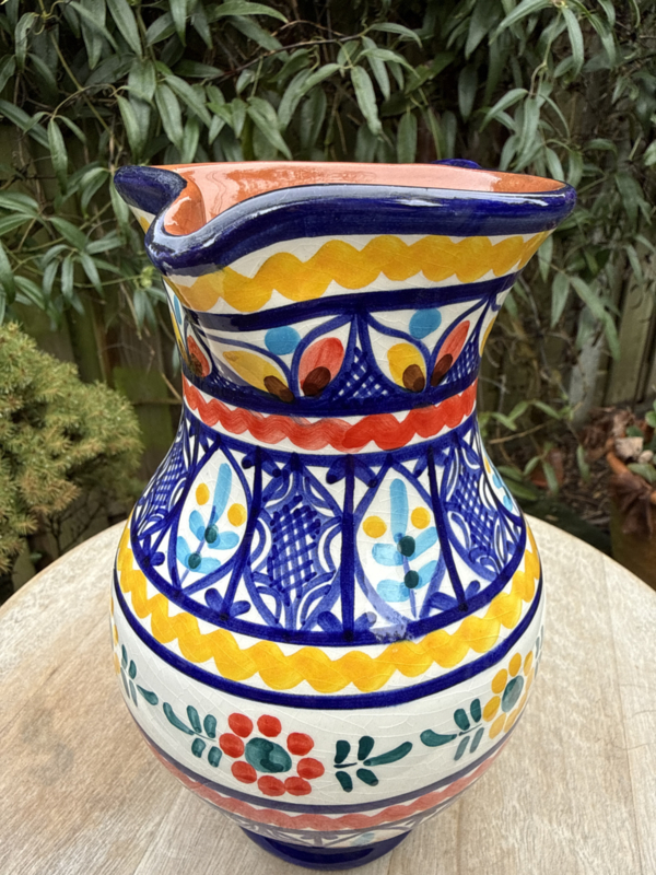 Een prachtig stukje Portugees vakmanschap: deze zeer decoratieve schenkkan is een ware blikvanger op uw tafel. Vervaardigd uit stevige kwaliteit aardewerk, is hij geschikt voor allerlei drankjes en een sfeervol accessoire waar u het hele jaar van kunt genieten. De kan is volledig handgemaakt en beschilderd, wat elk exemplaar een unieke uitstraling geeft. Met zijn royale inhoud van 1 liter is het de ideale kan voor het serveren van water, sap of wijn tijdens diners met familie en vrienden.