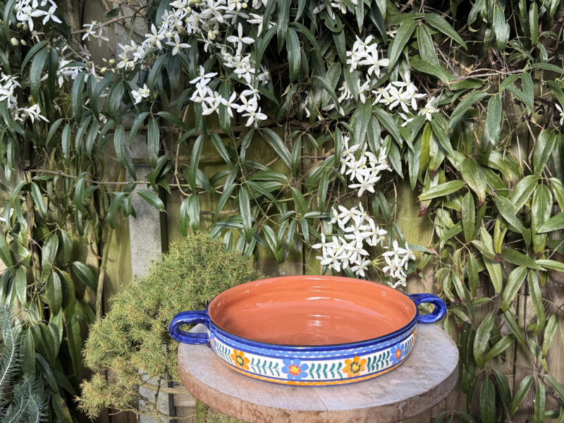 Elke schaal wordt met de hand vervaardigd en met zorg beschilderd door ambachtslieden in de Portugese regio Alentejo. De buitenzijde is gedecoreerd met vrolijke gekleurde bloemen en motieven op een helderwitte achtergrond, wat prachtig wordt geaccentueerd door de diepblauwe handgrepen en de warme bruine binnenkant. Omdat elk exemplaar 100% handwerk is, haalt u een uniek item in huis: ieder patroon en elke beschildering is uniek.