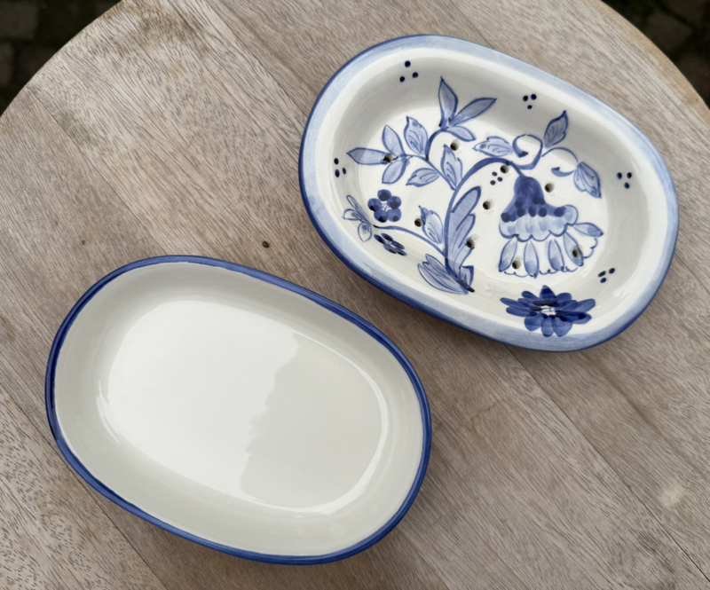 Deze zeepschaal wordt met de hand vervaardigd en beschilderd in Alcobaça, Portugal. Het ontwerp is geïnspireerd op de klassieke Portugese keramiekstijl: een gebroken witte basis versierd met blauwe bloemen en motieven. Zowel het bakje als het bijpassende uitlekbakje zijn smaakvol afgewerkt met een blauwe rand, wat zorgt voor een tijdloze en verfijnde uitstraling.