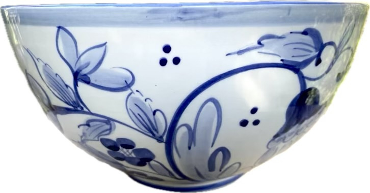 Deze diepe schaal wordt met de hand vervaardigd en beschilderd in Alcobaça, Portugal. Het ontwerp is geïnspireerd op de klassieke Portugese keramiekstijl: een gebroken witte achtergrond versierd met gedetailleerde blauwe bloemen en motieven. De schaal is stijlvol afgewerkt met een blauwe rand, wat zorgt voor een tijdloze en mediterrane uitstraling.