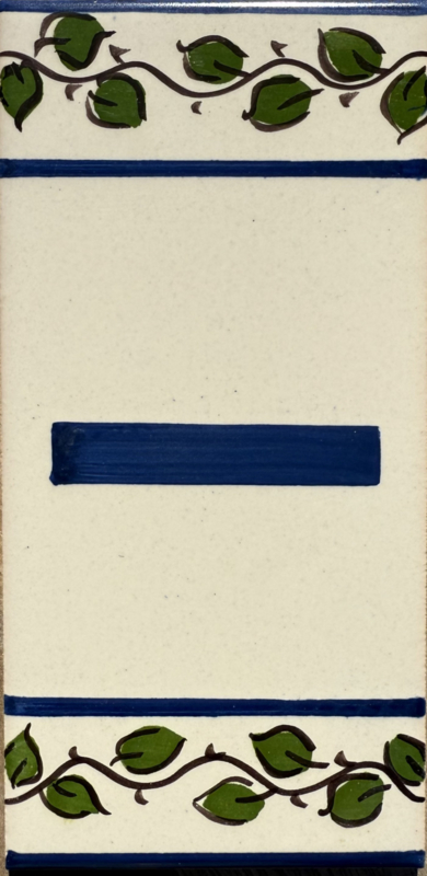Kleur / Patroon: gebroken witte achtergrond gedecoreerd aan de boven- en onderkant met donkergroene klimop. Tussenstreep in het donkerblauw beschilderd