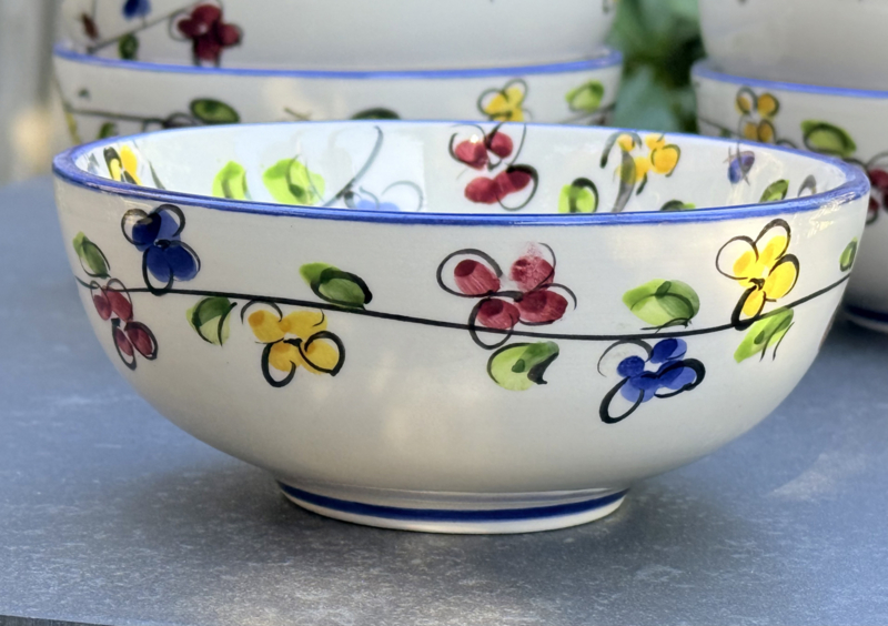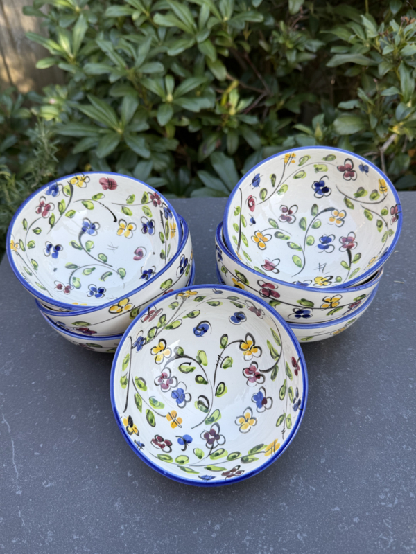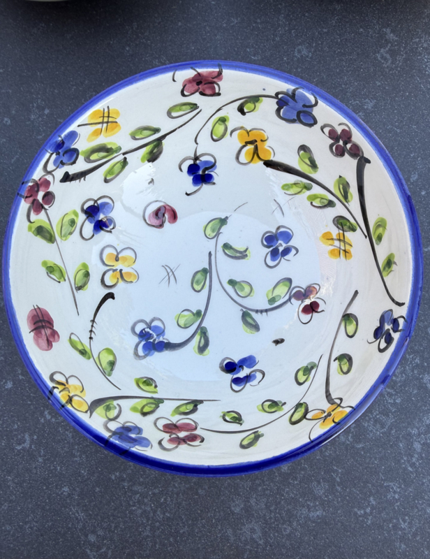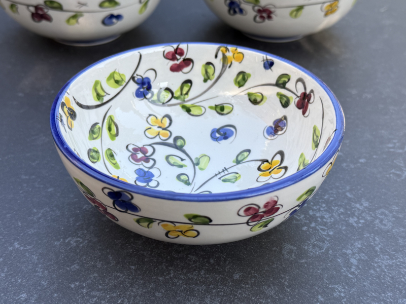 Deze kom is volledig met de hand vervaardigd en beschilderd in het keramiekcentrum Alcobaรงa, Portugal. Zowel de binnen- als de buitenkant zijn gedecoreerd met een verfijnd patroon van fijne bloemen en gekleurde motieven op een elegante, gebroken witte achtergrond. De strakke donkerblauwe rand vormt een stijlvol contrast en benadrukt de ambachtelijke afwerking.