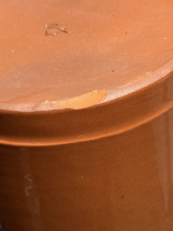 Dit specifieke exemplaar wordt aangeboden als 2de keus artikel. Aan de onderkant van de wijnkoeler zit een klein afgebroken schilfertje (zie de tweede foto voor detail). Dit defect is vanaf de zijkant niet zichtbaar en heeft geen invloed op de stabiliteit of werking van de koeler. Een unieke kans om dit handgemaakte stuk met een mooie korting te bemachtigen!