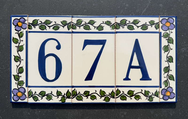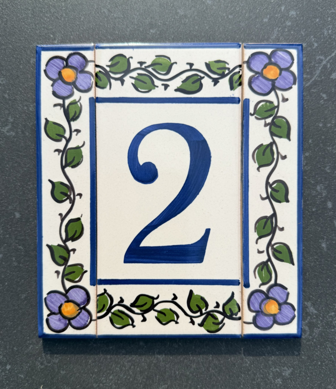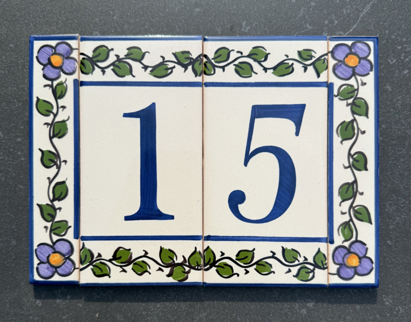 Artikelnummer: AC04025 OverzichtHandbeschilderde rand op tegel. Maak uw eigen samenstelling met de cijfers die u nodig hebt en kies uw favoriete bloemenkleur uit voor de zijrandjes, om de tegels af te sluiten aan de zijkant. Dit wordt zeer waarschinlijk de nieuwe blikvanger bij de ingang van uw woning 🤩🏠